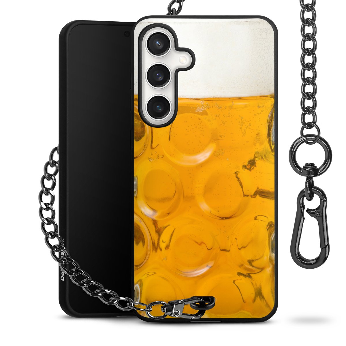Die Handyhülle verfügt über eine mittig am unteren Rand platzierte Öse, an der die Metallkette stabil befestigt ist. Bestelle die Hülle einfach für Dein Smartphone-Modell, dann passt sie wie angegossen und Du brauchst sie bloß einmal anzudrücken. Handy in die Tasche, Karabiner an den Hosenbund – schon kann die Party starten.