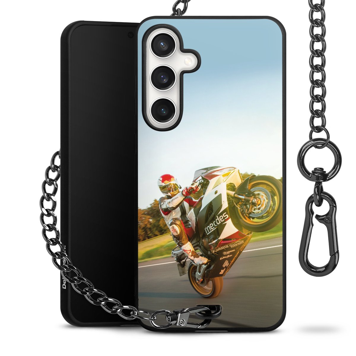 Die Handyhülle verfügt über eine mittig am unteren Rand platzierte Öse, an der die Metallkette stabil befestigt ist. Bestelle die Hülle einfach für Dein Smartphone-Modell, dann passt sie wie angegossen und Du brauchst sie bloß einmal anzudrücken. Handy in die Tasche, Karabiner an den Hosenbund – schon kann die Party starten.