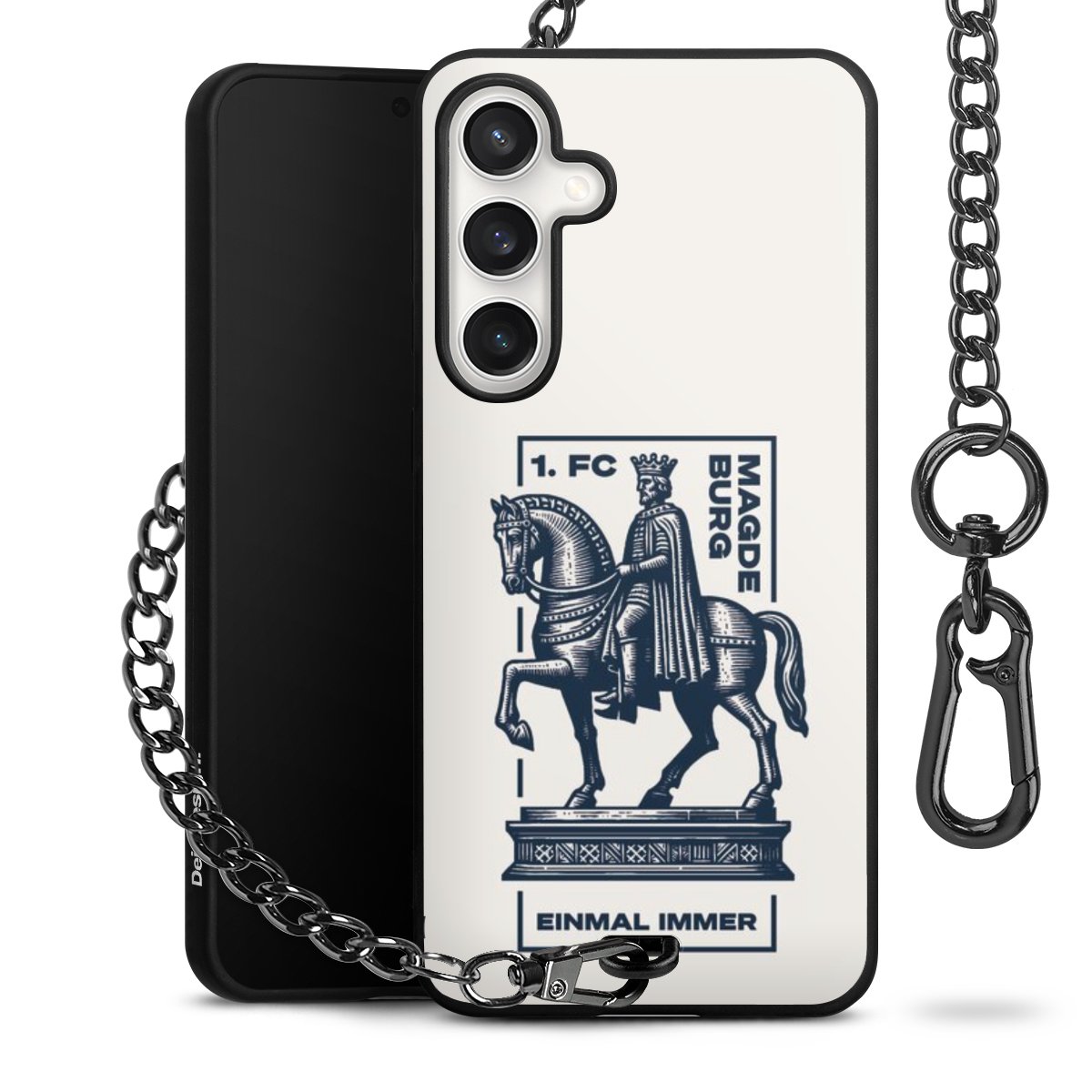Die Handyhülle verfügt über eine mittig am unteren Rand platzierte Öse, an der die Metallkette stabil befestigt ist. Bestelle die Hülle einfach für Dein Smartphone-Modell, dann passt sie wie angegossen und Du brauchst sie bloß einmal anzudrücken. Handy in die Tasche, Karabiner an den Hosenbund – schon kann die Party starten.