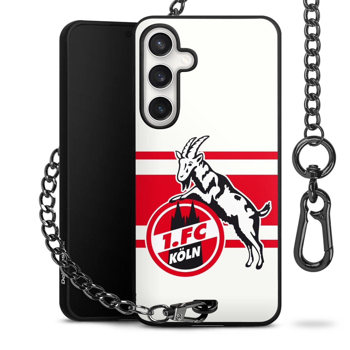 Die Handyhülle verfügt über eine mittig am unteren Rand platzierte Öse, an der die Metallkette stabil befestigt ist. Bestelle die Hülle einfach für Dein Smartphone-Modell, dann passt sie wie angegossen und Du brauchst sie bloß einmal anzudrücken. Handy in die Tasche, Karabiner an den Hosenbund – schon kann die Party starten.
