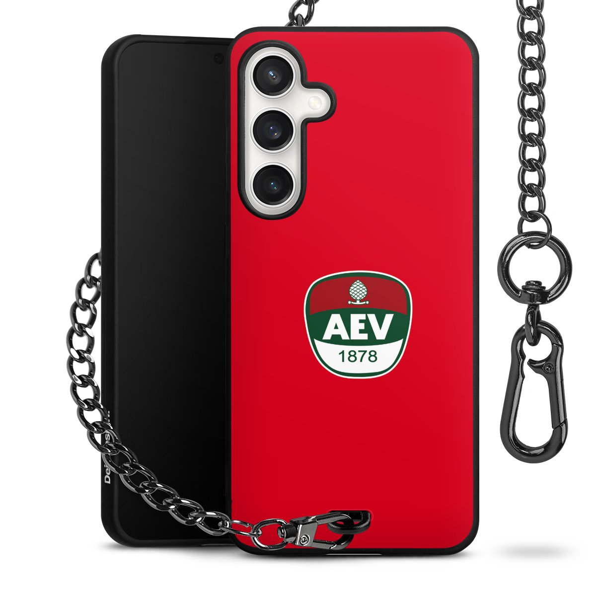 Die Handyhülle verfügt über eine mittig am unteren Rand platzierte Öse, an der die Metallkette stabil befestigt ist. Bestelle die Hülle einfach für Dein Smartphone-Modell, dann passt sie wie angegossen und Du brauchst sie bloß einmal anzudrücken. Handy in die Tasche, Karabiner an den Hosenbund – schon kann die Party starten.