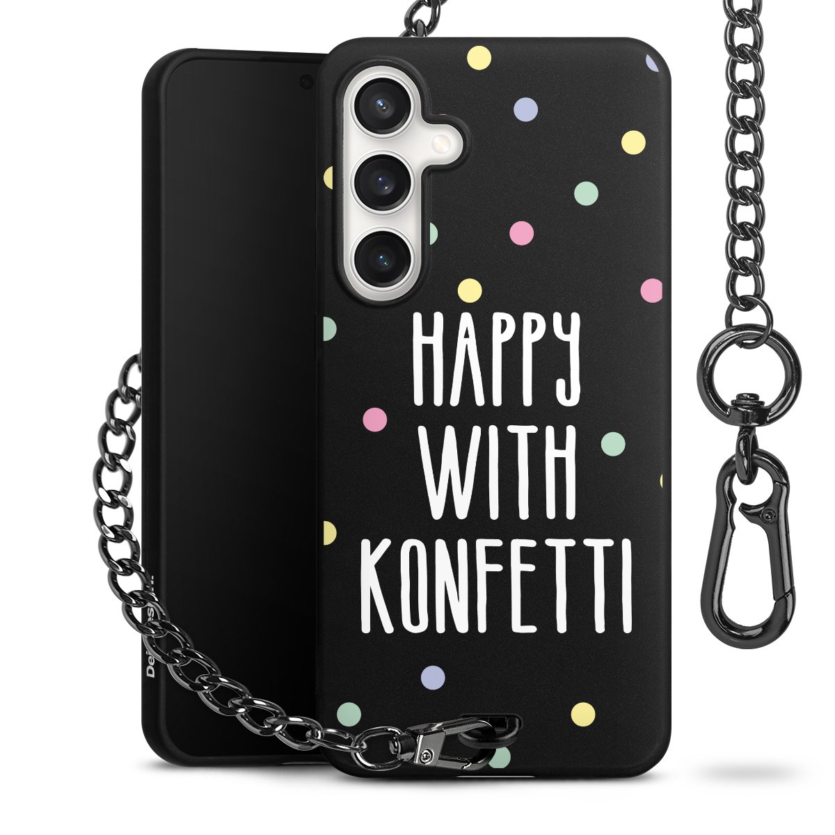Die mattschwarze Silikon-Handyhülle besteht aus robustem TPU (thermoplastisches Polyurethan). Sie ist flexibel und schützt Dein Smartphone vor Stößen und Kratzern. Die Kette sowie der Karabinerhaken sind aus Metall in Gunmetal-Optik gefertigt. Für dieses Produkt kommen ausschließlich TÜV-geprüfte Materialien zum Einsatz.