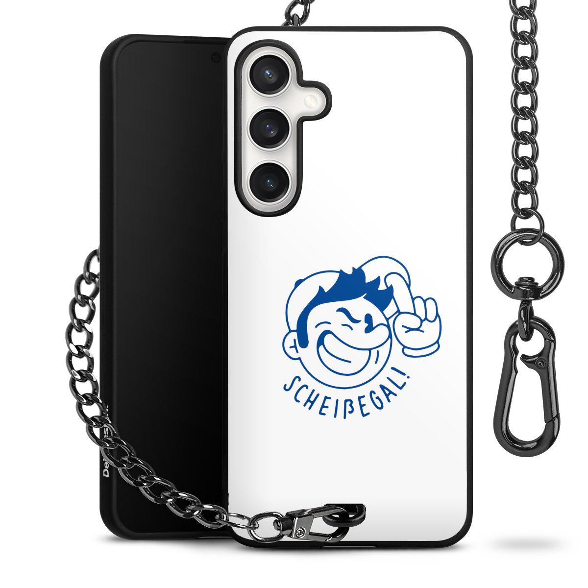 Die Handyhülle verfügt über eine mittig am unteren Rand platzierte Öse, an der die Metallkette stabil befestigt ist. Bestelle die Hülle einfach für Dein Smartphone-Modell, dann passt sie wie angegossen und Du brauchst sie bloß einmal anzudrücken. Handy in die Tasche, Karabiner an den Hosenbund – schon kann die Party starten.