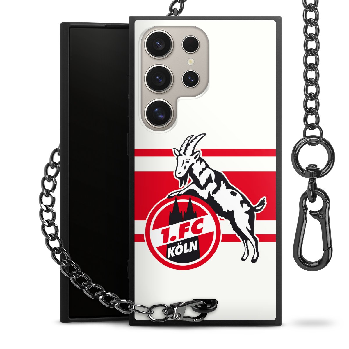 Die Handyhülle verfügt über eine mittig am unteren Rand platzierte Öse, an der die Metallkette stabil befestigt ist. Bestelle die Hülle einfach für Dein Smartphone-Modell, dann passt sie wie angegossen und Du brauchst sie bloß einmal anzudrücken. Handy in die Tasche, Karabiner an den Hosenbund – schon kann die Party starten.