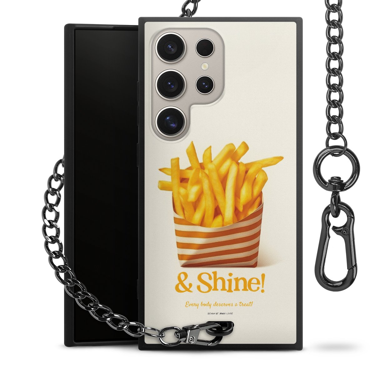 Die Handyhülle verfügt über eine mittig am unteren Rand platzierte Öse, an der die Metallkette stabil befestigt ist. Bestelle die Hülle einfach für Dein Smartphone-Modell, dann passt sie wie angegossen und Du brauchst sie bloß einmal anzudrücken. Handy in die Tasche, Karabiner an den Hosenbund – schon kann die Party starten.