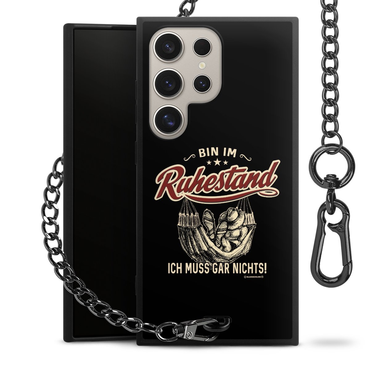 Die mattschwarze Silikon-Handyhülle besteht aus robustem TPU (thermoplastisches Polyurethan). Sie ist flexibel und schützt Dein Smartphone vor Stößen und Kratzern. Die Kette sowie der Karabinerhaken sind aus Metall in Gunmetal-Optik gefertigt. Für dieses Produkt kommen ausschließlich TÜV-geprüfte Materialien zum Einsatz.