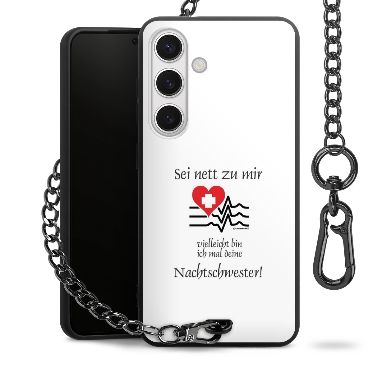 Die mattschwarze Silikon-Handyhülle besteht aus robustem TPU (thermoplastisches Polyurethan). Sie ist flexibel und schützt Dein Smartphone vor Stößen und Kratzern. Die Kette sowie der Karabinerhaken sind aus Metall in Gunmetal-Optik gefertigt. Für dieses Produkt kommen ausschließlich TÜV-geprüfte Materialien zum Einsatz.