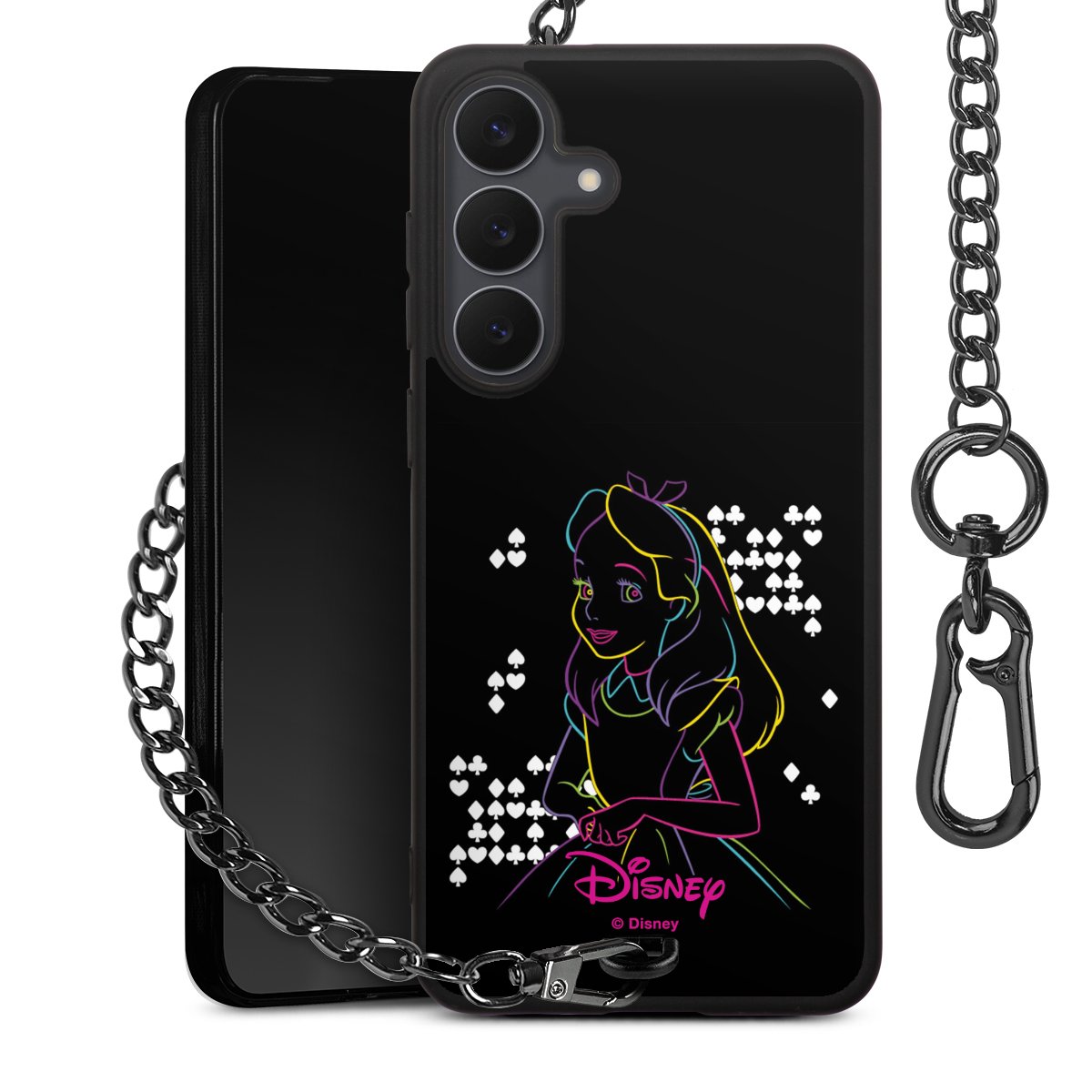 Die Handyhülle verfügt über eine mittig am unteren Rand platzierte Öse, an der die Metallkette stabil befestigt ist. Bestelle die Hülle einfach für Dein Smartphone-Modell, dann passt sie wie angegossen und Du brauchst sie bloß einmal anzudrücken. Handy in die Tasche, Karabiner an den Hosenbund – schon kann die Party starten.