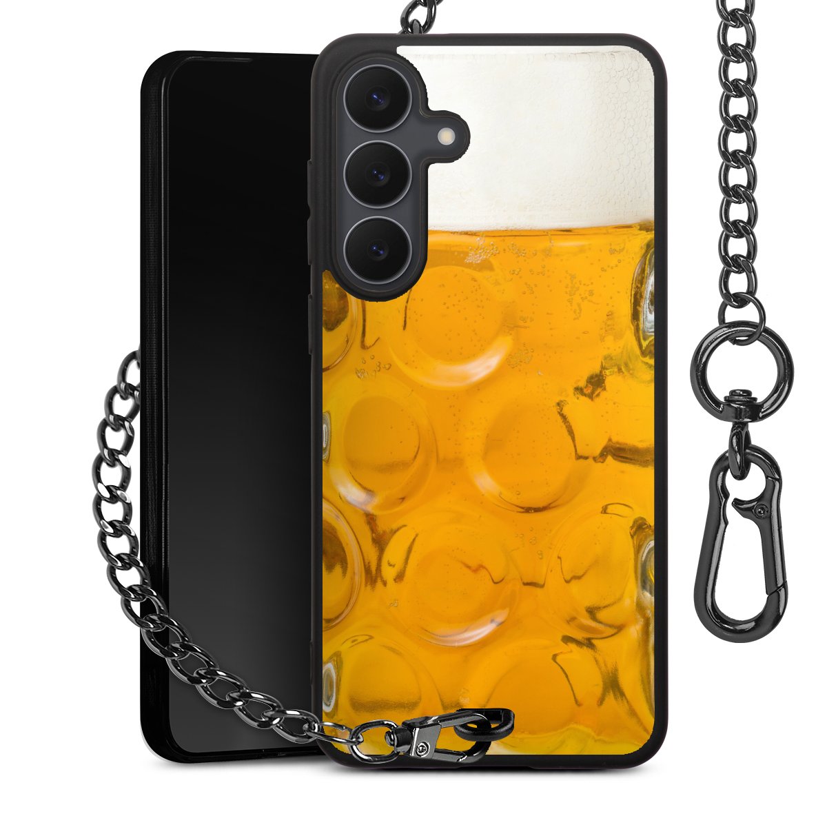Die Handyhülle verfügt über eine mittig am unteren Rand platzierte Öse, an der die Metallkette stabil befestigt ist. Bestelle die Hülle einfach für Dein Smartphone-Modell, dann passt sie wie angegossen und Du brauchst sie bloß einmal anzudrücken. Handy in die Tasche, Karabiner an den Hosenbund – schon kann die Party starten.