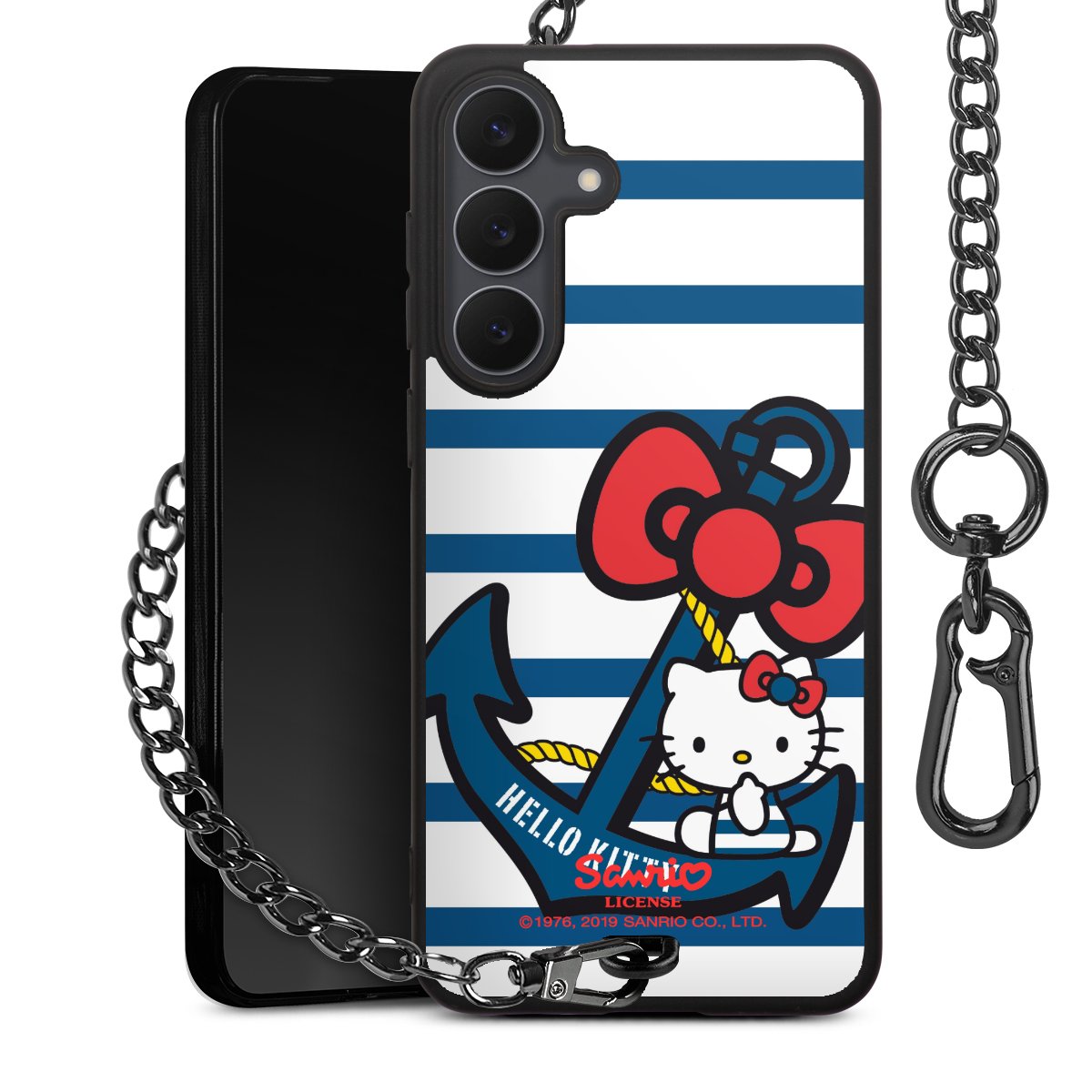 Die Handyhülle verfügt über eine mittig am unteren Rand platzierte Öse, an der die Metallkette stabil befestigt ist. Bestelle die Hülle einfach für Dein Smartphone-Modell, dann passt sie wie angegossen und Du brauchst sie bloß einmal anzudrücken. Handy in die Tasche, Karabiner an den Hosenbund – schon kann die Party starten.