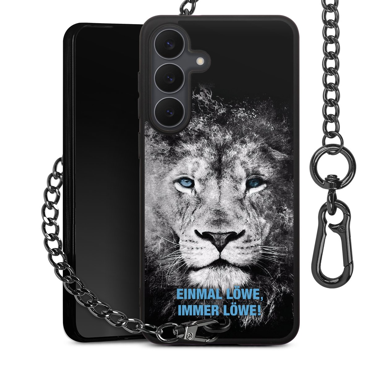 Die Handyhülle verfügt über eine mittig am unteren Rand platzierte Öse, an der die Metallkette stabil befestigt ist. Bestelle die Hülle einfach für Dein Smartphone-Modell, dann passt sie wie angegossen und Du brauchst sie bloß einmal anzudrücken. Handy in die Tasche, Karabiner an den Hosenbund – schon kann die Party starten.