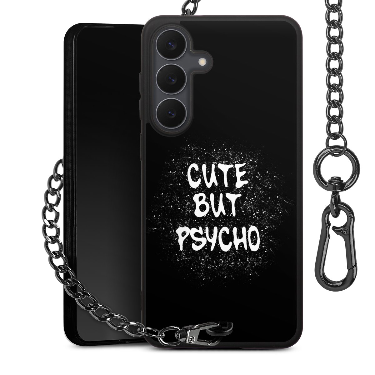 Die mattschwarze Silikon-Handyhülle besteht aus robustem TPU (thermoplastisches Polyurethan). Sie ist flexibel und schützt Dein Smartphone vor Stößen und Kratzern. Die Kette sowie der Karabinerhaken sind aus Metall in Gunmetal-Optik gefertigt. Für dieses Produkt kommen ausschließlich TÜV-geprüfte Materialien zum Einsatz.