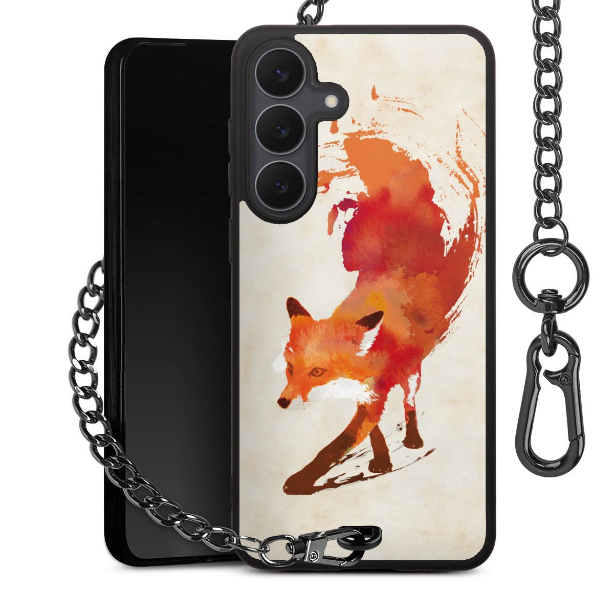 Die Handyhülle verfügt über eine mittig am unteren Rand platzierte Öse, an der die Metallkette stabil befestigt ist. Bestelle die Hülle einfach für Dein Smartphone-Modell, dann passt sie wie angegossen und Du brauchst sie bloß einmal anzudrücken. Handy in die Tasche, Karabiner an den Hosenbund – schon kann die Party starten.