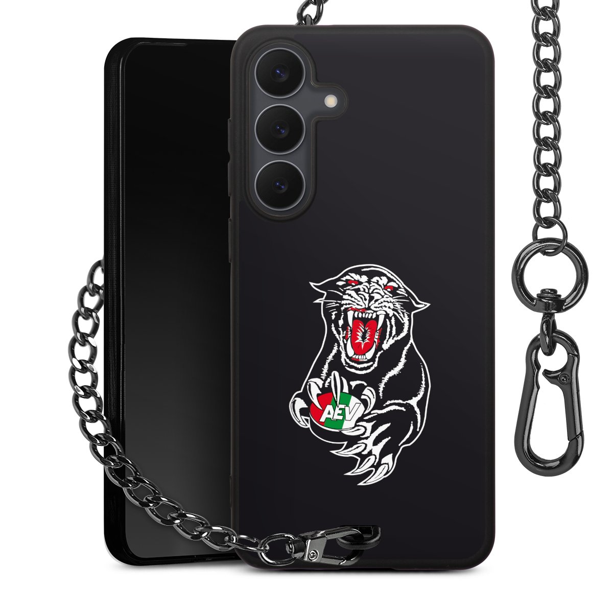 Die mattschwarze Silikon-Handyhülle besteht aus robustem TPU (thermoplastisches Polyurethan). Sie ist flexibel und schützt Dein Smartphone vor Stößen und Kratzern. Die Kette sowie der Karabinerhaken sind aus Metall in Gunmetal-Optik gefertigt. Für dieses Produkt kommen ausschließlich TÜV-geprüfte Materialien zum Einsatz.