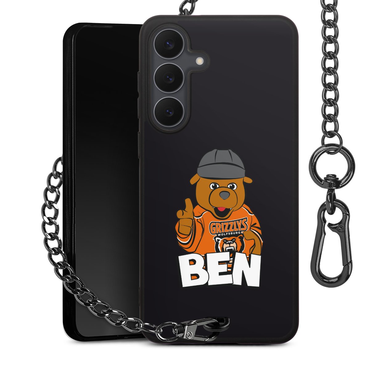 Die mattschwarze Silikon-Handyhülle besteht aus robustem TPU (thermoplastisches Polyurethan). Sie ist flexibel und schützt Dein Smartphone vor Stößen und Kratzern. Die Kette sowie der Karabinerhaken sind aus Metall in Gunmetal-Optik gefertigt. Für dieses Produkt kommen ausschließlich TÜV-geprüfte Materialien zum Einsatz.