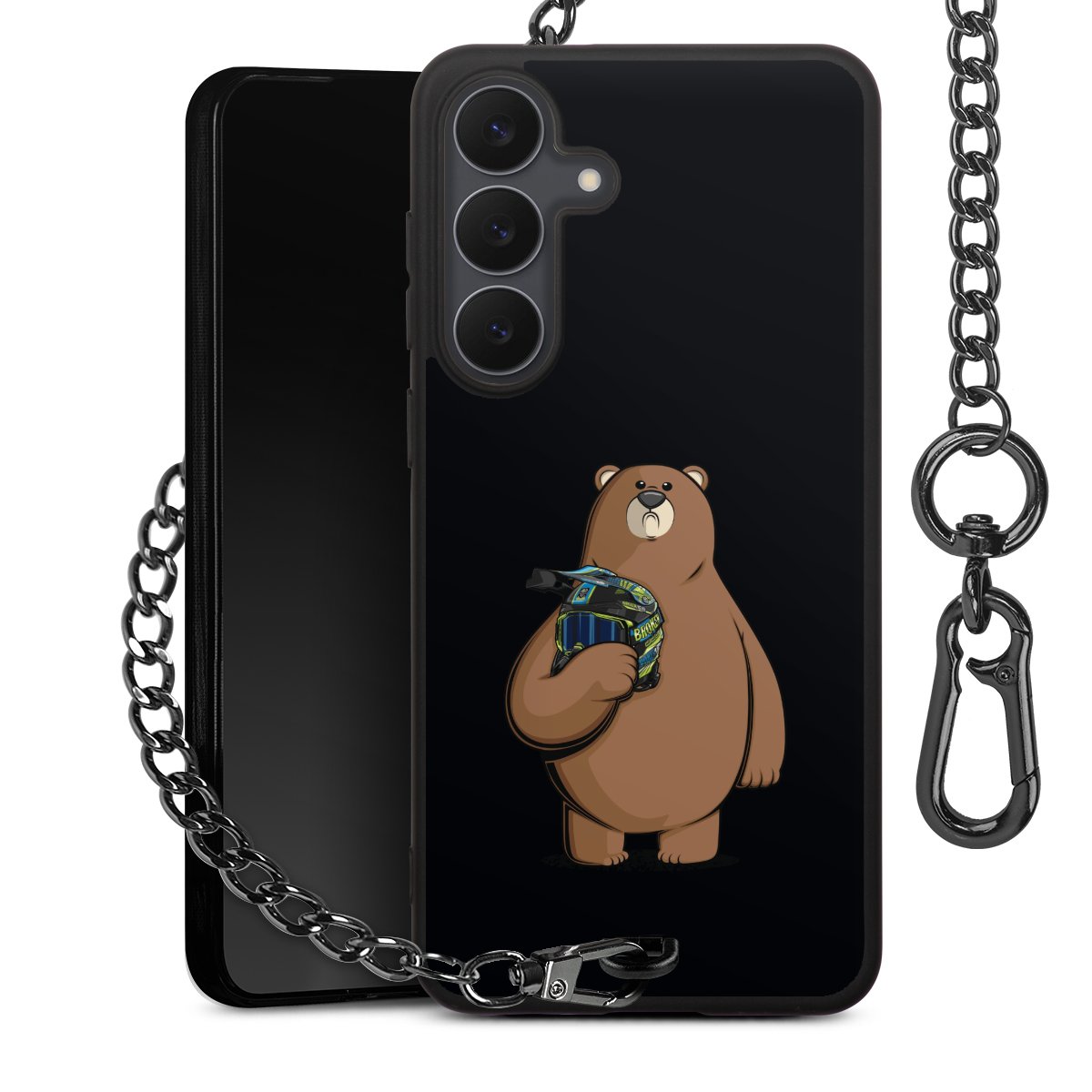 Die mattschwarze Silikon-Handyhülle besteht aus robustem TPU (thermoplastisches Polyurethan). Sie ist flexibel und schützt Dein Smartphone vor Stößen und Kratzern. Die Kette sowie der Karabinerhaken sind aus Metall in Gunmetal-Optik gefertigt. Für dieses Produkt kommen ausschließlich TÜV-geprüfte Materialien zum Einsatz.