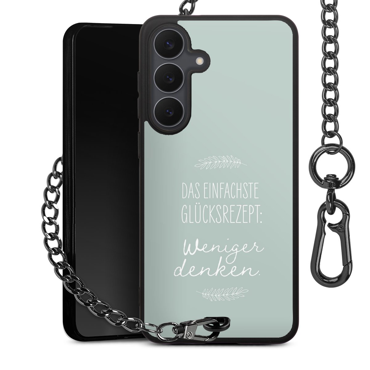 Die mattschwarze Silikon-Handyhülle besteht aus robustem TPU (thermoplastisches Polyurethan). Sie ist flexibel und schützt Dein Smartphone vor Stößen und Kratzern. Die Kette sowie der Karabinerhaken sind aus Metall in Gunmetal-Optik gefertigt. Für dieses Produkt kommen ausschließlich TÜV-geprüfte Materialien zum Einsatz.