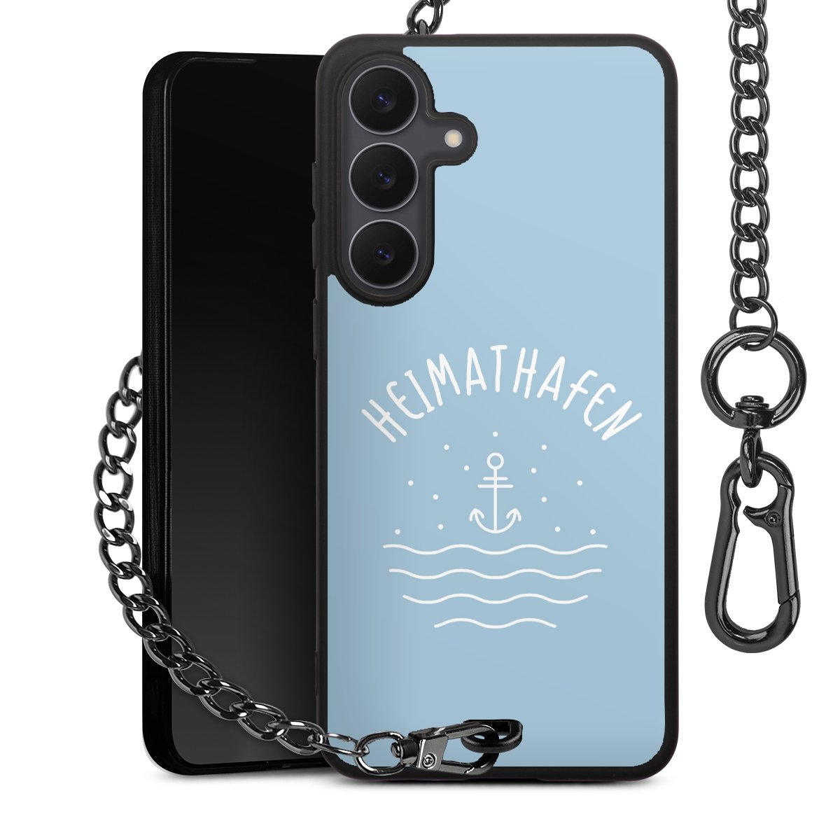 Die mattschwarze Silikon-Handyhülle besteht aus robustem TPU (thermoplastisches Polyurethan). Sie ist flexibel und schützt Dein Smartphone vor Stößen und Kratzern. Die Kette sowie der Karabinerhaken sind aus Metall in Gunmetal-Optik gefertigt. Für dieses Produkt kommen ausschließlich TÜV-geprüfte Materialien zum Einsatz.
