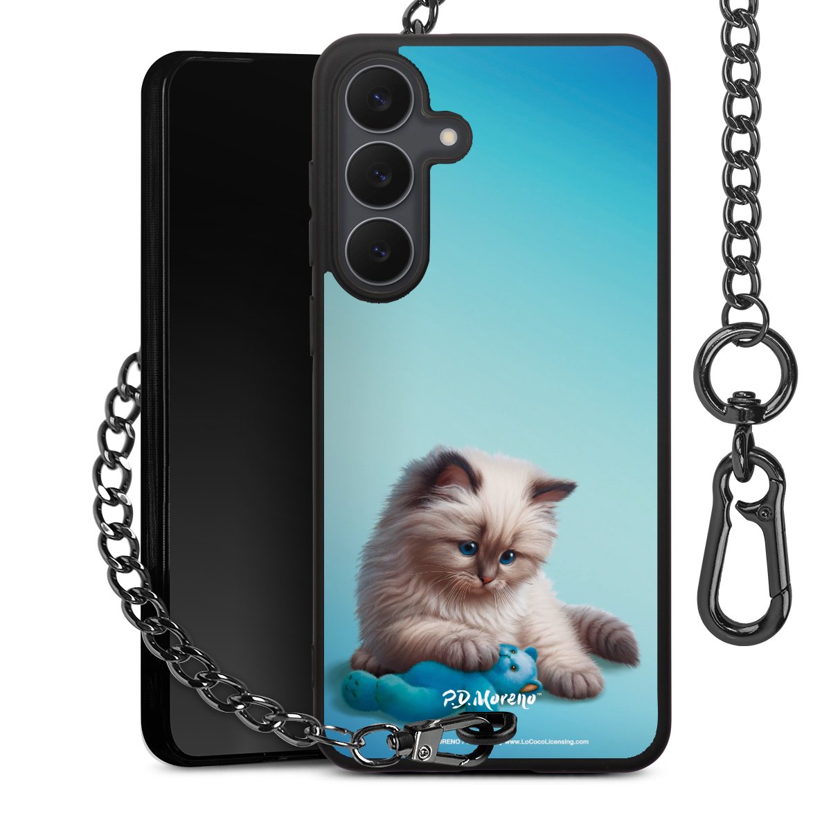 Die mattschwarze Silikon-Handyhülle besteht aus robustem TPU (thermoplastisches Polyurethan). Sie ist flexibel und schützt Dein Smartphone vor Stößen und Kratzern. Die Kette sowie der Karabinerhaken sind aus Metall in Gunmetal-Optik gefertigt. Für dieses Produkt kommen ausschließlich TÜV-geprüfte Materialien zum Einsatz.