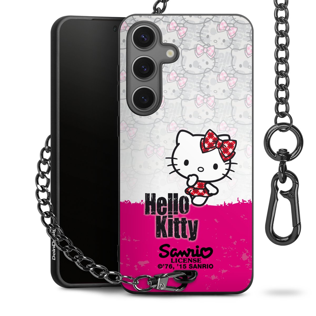 Die Handyhülle verfügt über eine mittig am unteren Rand platzierte Öse, an der die Metallkette stabil befestigt ist. Bestelle die Hülle einfach für Dein Smartphone-Modell, dann passt sie wie angegossen und Du brauchst sie bloß einmal anzudrücken. Handy in die Tasche, Karabiner an den Hosenbund – schon kann die Party starten.