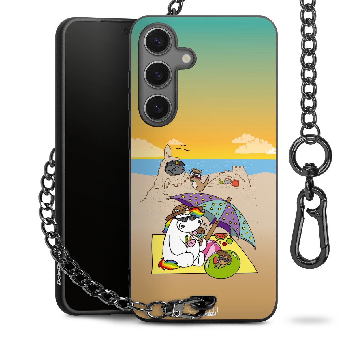 Die Handyhülle verfügt über eine mittig am unteren Rand platzierte Öse, an der die Metallkette stabil befestigt ist. Bestelle die Hülle einfach für Dein Smartphone-Modell, dann passt sie wie angegossen und Du brauchst sie bloß einmal anzudrücken. Handy in die Tasche, Karabiner an den Hosenbund – schon kann die Party starten.