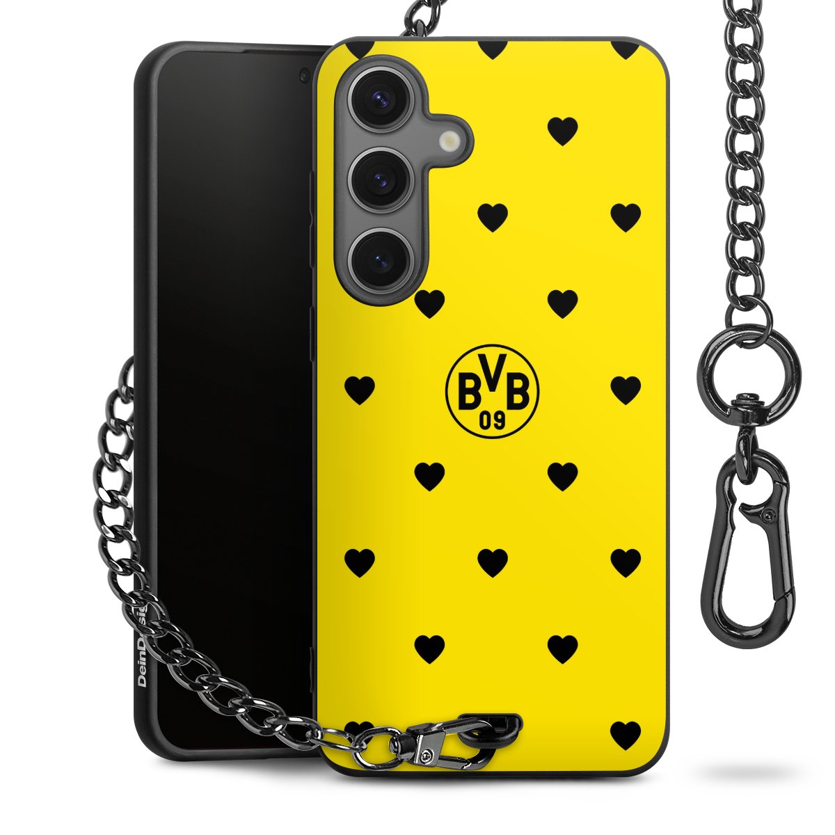 Die mattschwarze Silikon-Handyhülle besteht aus robustem TPU (thermoplastisches Polyurethan). Sie ist flexibel und schützt Dein Smartphone vor Stößen und Kratzern. Die Kette sowie der Karabinerhaken sind aus Metall in Gunmetal-Optik gefertigt. Für dieses Produkt kommen ausschließlich TÜV-geprüfte Materialien zum Einsatz.
