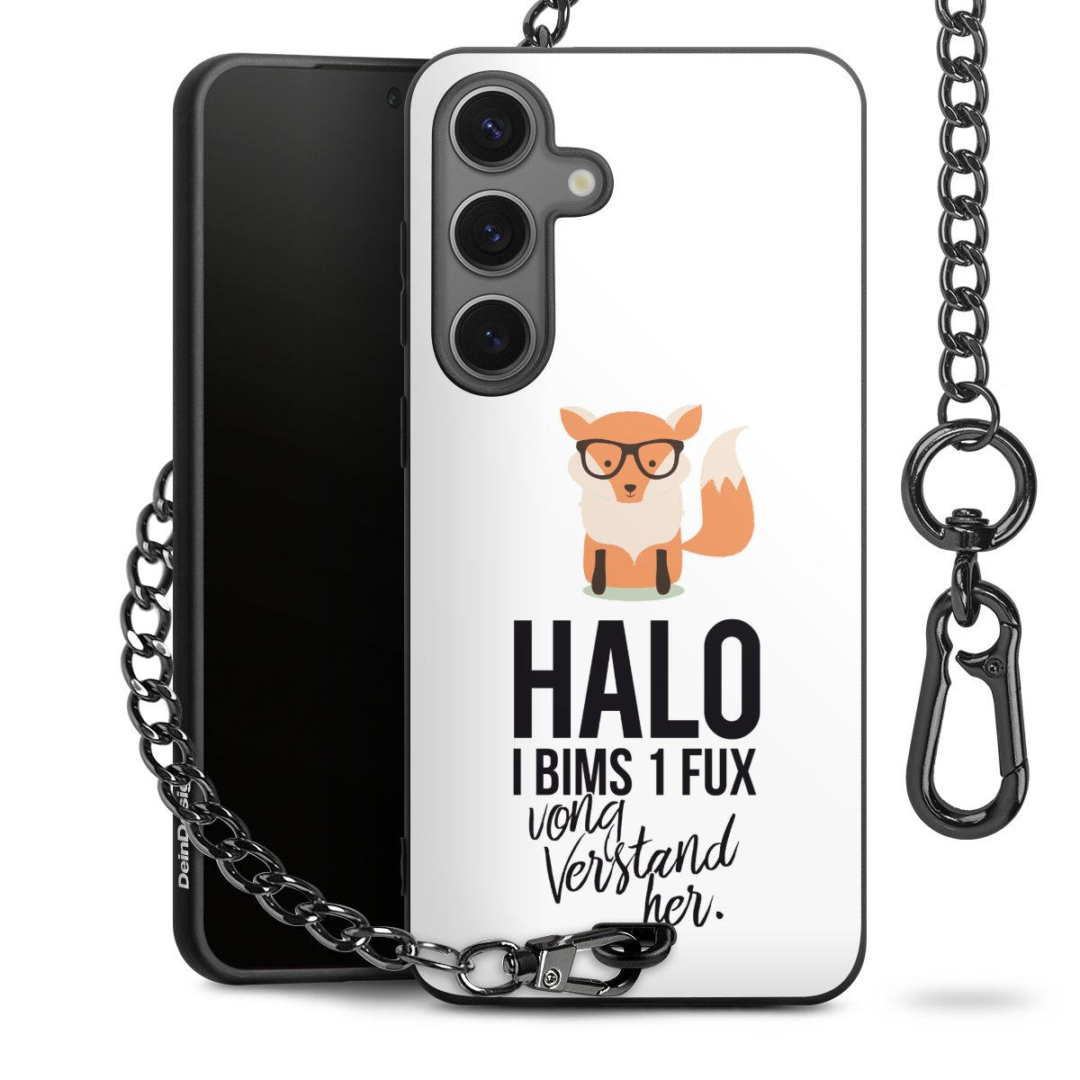 Die Handyhülle verfügt über eine mittig am unteren Rand platzierte Öse, an der die Metallkette stabil befestigt ist. Bestelle die Hülle einfach für Dein Smartphone-Modell, dann passt sie wie angegossen und Du brauchst sie bloß einmal anzudrücken. Handy in die Tasche, Karabiner an den Hosenbund – schon kann die Party starten.
