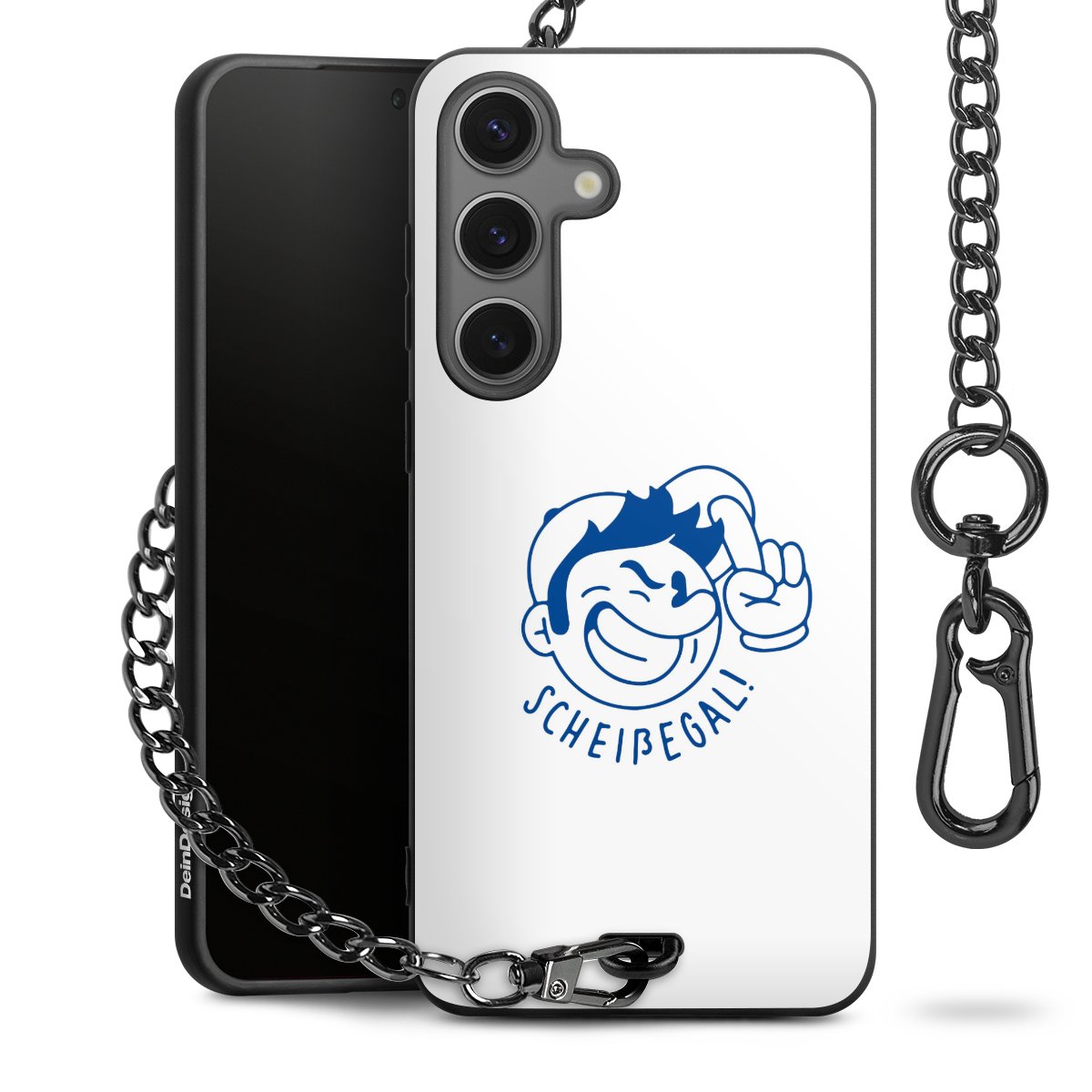 Die Handyhülle verfügt über eine mittig am unteren Rand platzierte Öse, an der die Metallkette stabil befestigt ist. Bestelle die Hülle einfach für Dein Smartphone-Modell, dann passt sie wie angegossen und Du brauchst sie bloß einmal anzudrücken. Handy in die Tasche, Karabiner an den Hosenbund – schon kann die Party starten.