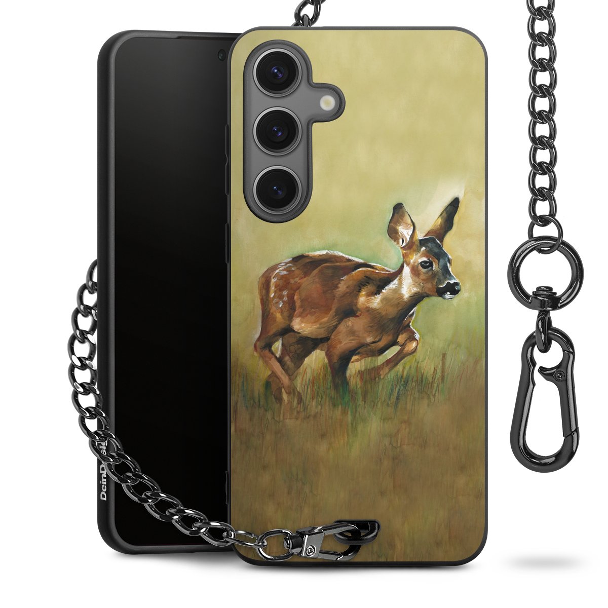 Die Handyhülle verfügt über eine mittig am unteren Rand platzierte Öse, an der die Metallkette stabil befestigt ist. Bestelle die Hülle einfach für Dein Smartphone-Modell, dann passt sie wie angegossen und Du brauchst sie bloß einmal anzudrücken. Handy in die Tasche, Karabiner an den Hosenbund – schon kann die Party starten.