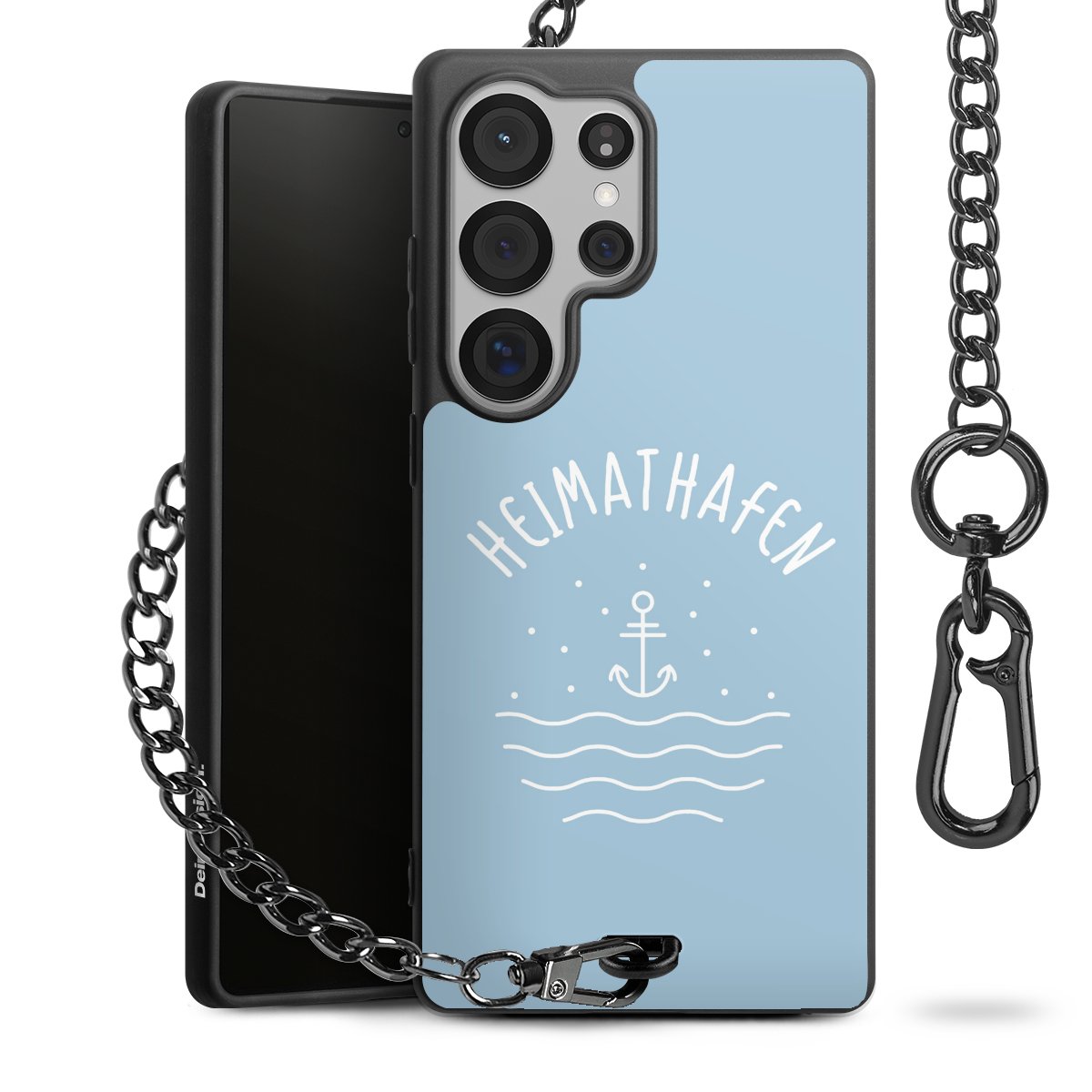 Die mattschwarze Silikon-Handyhülle besteht aus robustem TPU (thermoplastisches Polyurethan). Sie ist flexibel und schützt Dein Smartphone vor Stößen und Kratzern. Die Kette sowie der Karabinerhaken sind aus Metall in Gunmetal-Optik gefertigt. Für dieses Produkt kommen ausschließlich TÜV-geprüfte Materialien zum Einsatz.