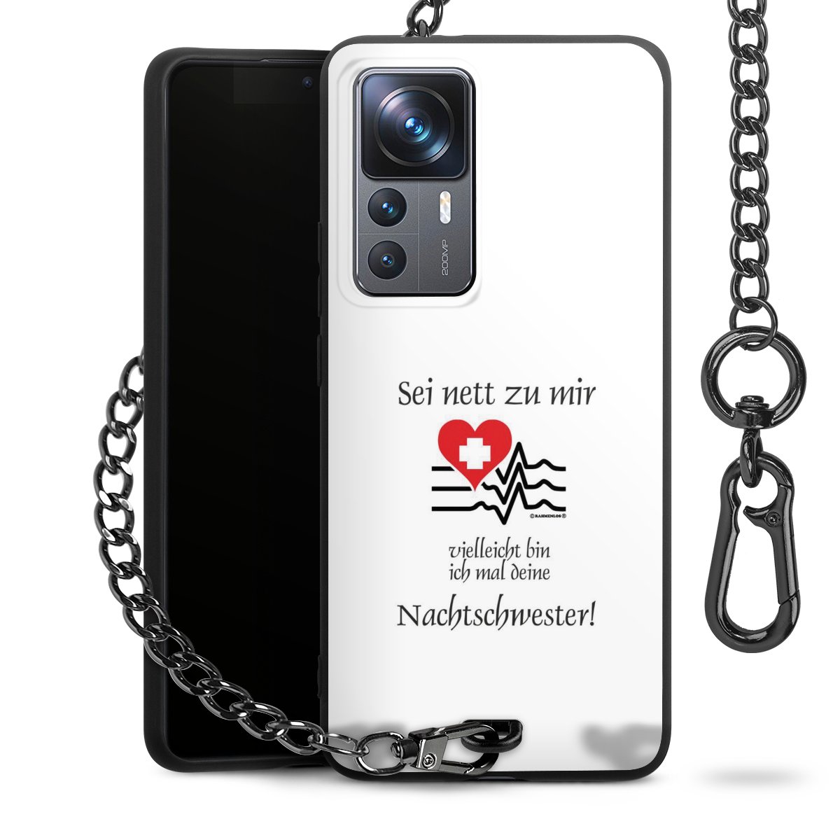 Die mattschwarze Silikon-Handyhülle besteht aus robustem TPU (thermoplastisches Polyurethan). Sie ist flexibel und schützt Dein Smartphone vor Stößen und Kratzern. Die Kette sowie der Karabinerhaken sind aus Metall in Gunmetal-Optik gefertigt. Für dieses Produkt kommen ausschließlich TÜV-geprüfte Materialien zum Einsatz.