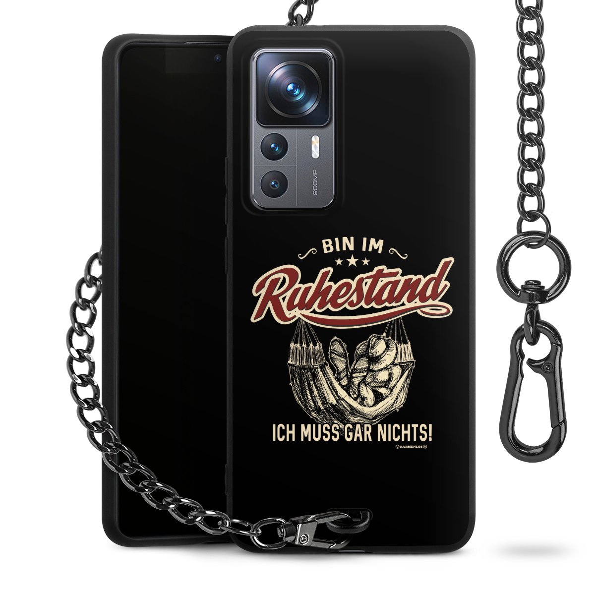 Die mattschwarze Silikon-Handyhülle besteht aus robustem TPU (thermoplastisches Polyurethan). Sie ist flexibel und schützt Dein Smartphone vor Stößen und Kratzern. Die Kette sowie der Karabinerhaken sind aus Metall in Gunmetal-Optik gefertigt. Für dieses Produkt kommen ausschließlich TÜV-geprüfte Materialien zum Einsatz.