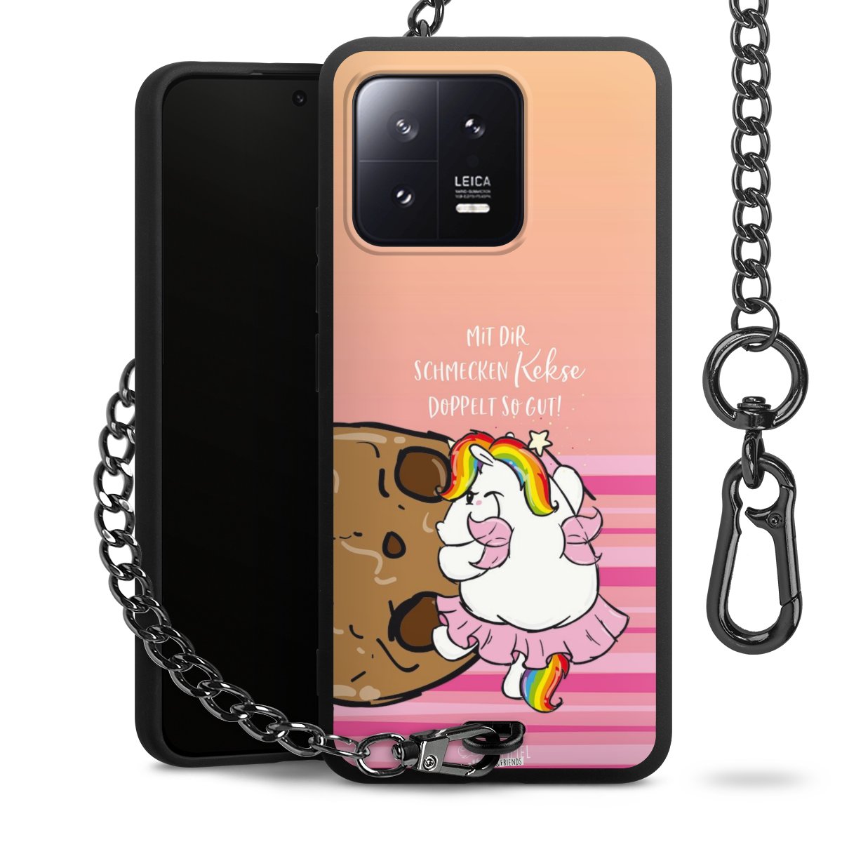 Die Handyhülle verfügt über eine mittig am unteren Rand platzierte Öse, an der die Metallkette stabil befestigt ist. Bestelle die Hülle einfach für Dein Smartphone-Modell, dann passt sie wie angegossen und Du brauchst sie bloß einmal anzudrücken. Handy in die Tasche, Karabiner an den Hosenbund – schon kann die Party starten.