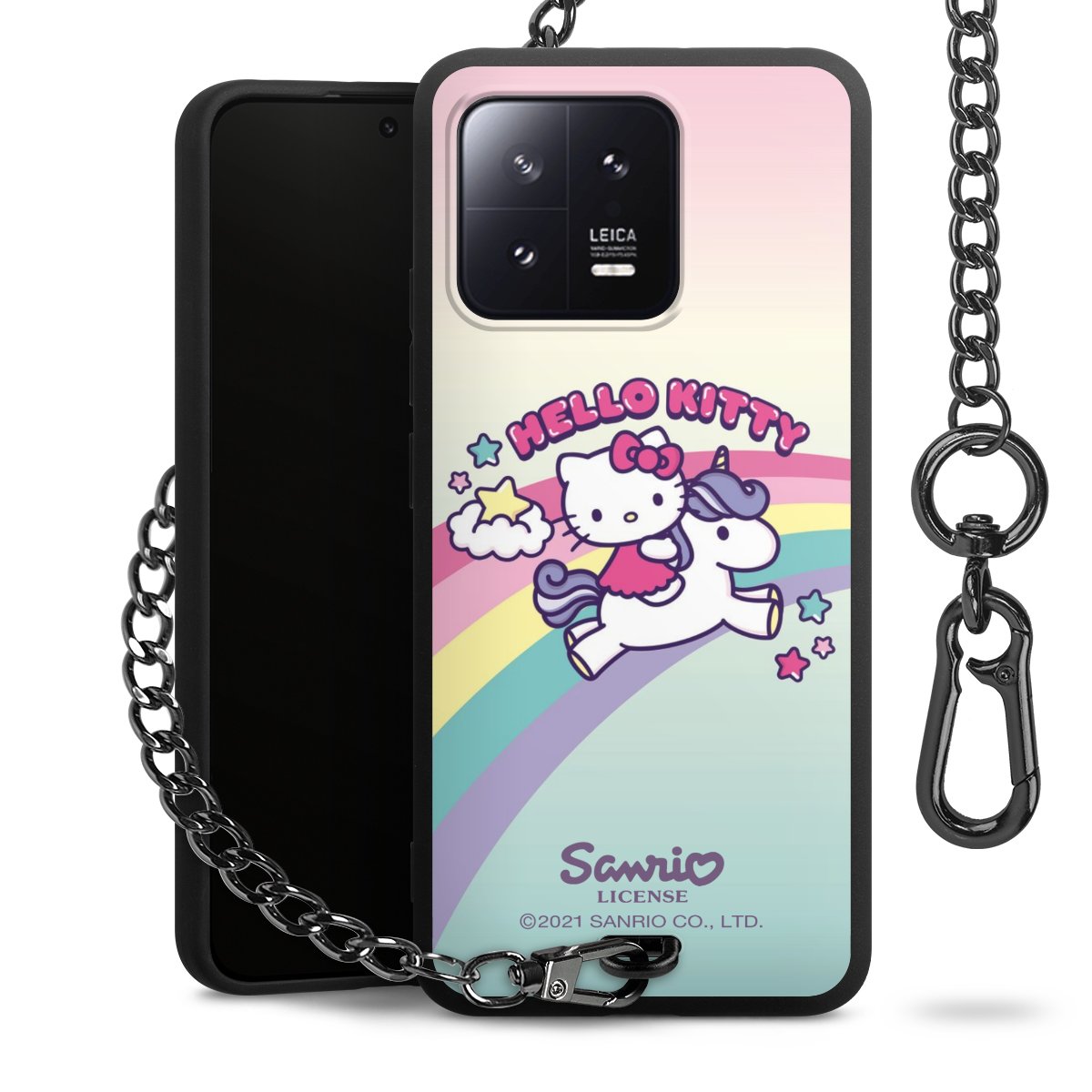 Die Handyhülle verfügt über eine mittig am unteren Rand platzierte Öse, an der die Metallkette stabil befestigt ist. Bestelle die Hülle einfach für Dein Smartphone-Modell, dann passt sie wie angegossen und Du brauchst sie bloß einmal anzudrücken. Handy in die Tasche, Karabiner an den Hosenbund – schon kann die Party starten.