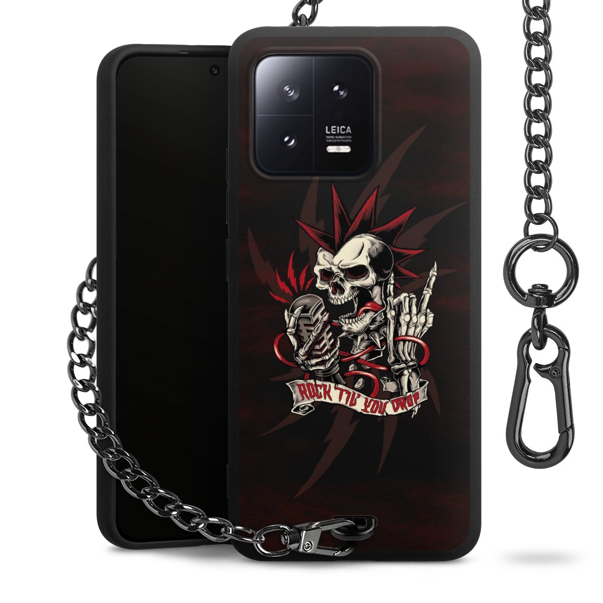 Die Handyhülle verfügt über eine mittig am unteren Rand platzierte Öse, an der die Metallkette stabil befestigt ist. Bestelle die Hülle einfach für Dein Smartphone-Modell, dann passt sie wie angegossen und Du brauchst sie bloß einmal anzudrücken. Handy in die Tasche, Karabiner an den Hosenbund – schon kann die Party starten.