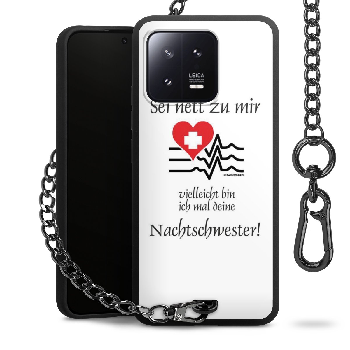 Die mattschwarze Silikon-Handyhülle besteht aus robustem TPU (thermoplastisches Polyurethan). Sie ist flexibel und schützt Dein Smartphone vor Stößen und Kratzern. Die Kette sowie der Karabinerhaken sind aus Metall in Gunmetal-Optik gefertigt. Für dieses Produkt kommen ausschließlich TÜV-geprüfte Materialien zum Einsatz.