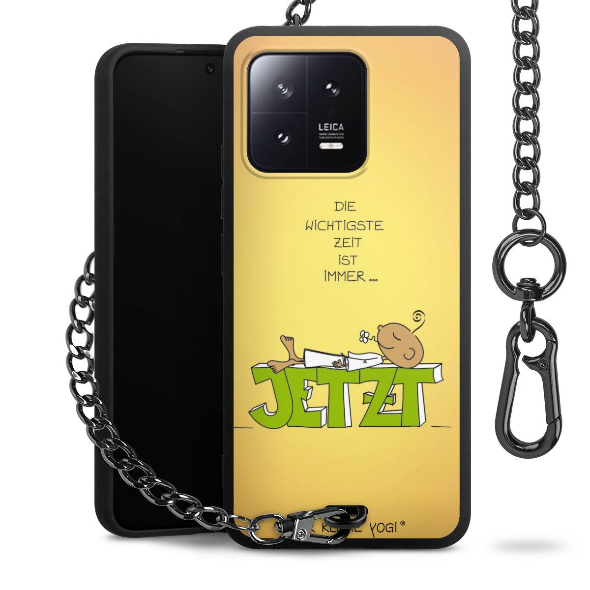 Die Handyhülle verfügt über eine mittig am unteren Rand platzierte Öse, an der die Metallkette stabil befestigt ist. Bestelle die Hülle einfach für Dein Smartphone-Modell, dann passt sie wie angegossen und Du brauchst sie bloß einmal anzudrücken. Handy in die Tasche, Karabiner an den Hosenbund – schon kann die Party starten.
