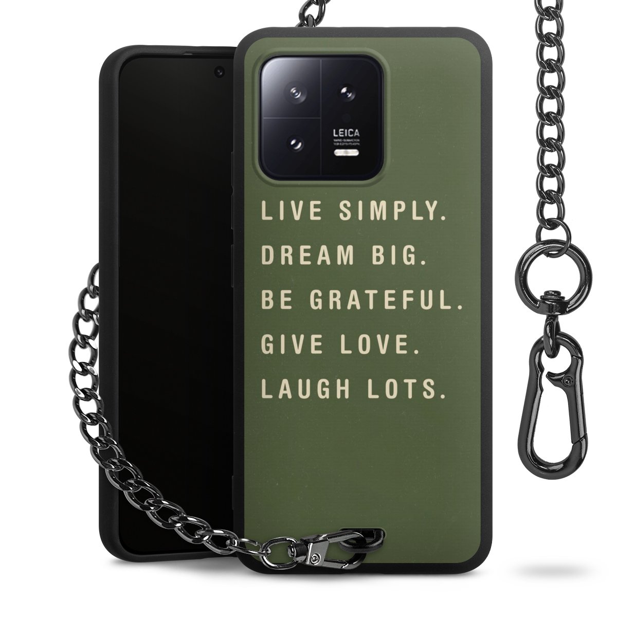 Die mattschwarze Silikon-Handyhülle besteht aus robustem TPU (thermoplastisches Polyurethan). Sie ist flexibel und schützt Dein Smartphone vor Stößen und Kratzern. Die Kette sowie der Karabinerhaken sind aus Metall in Gunmetal-Optik gefertigt. Für dieses Produkt kommen ausschließlich TÜV-geprüfte Materialien zum Einsatz.