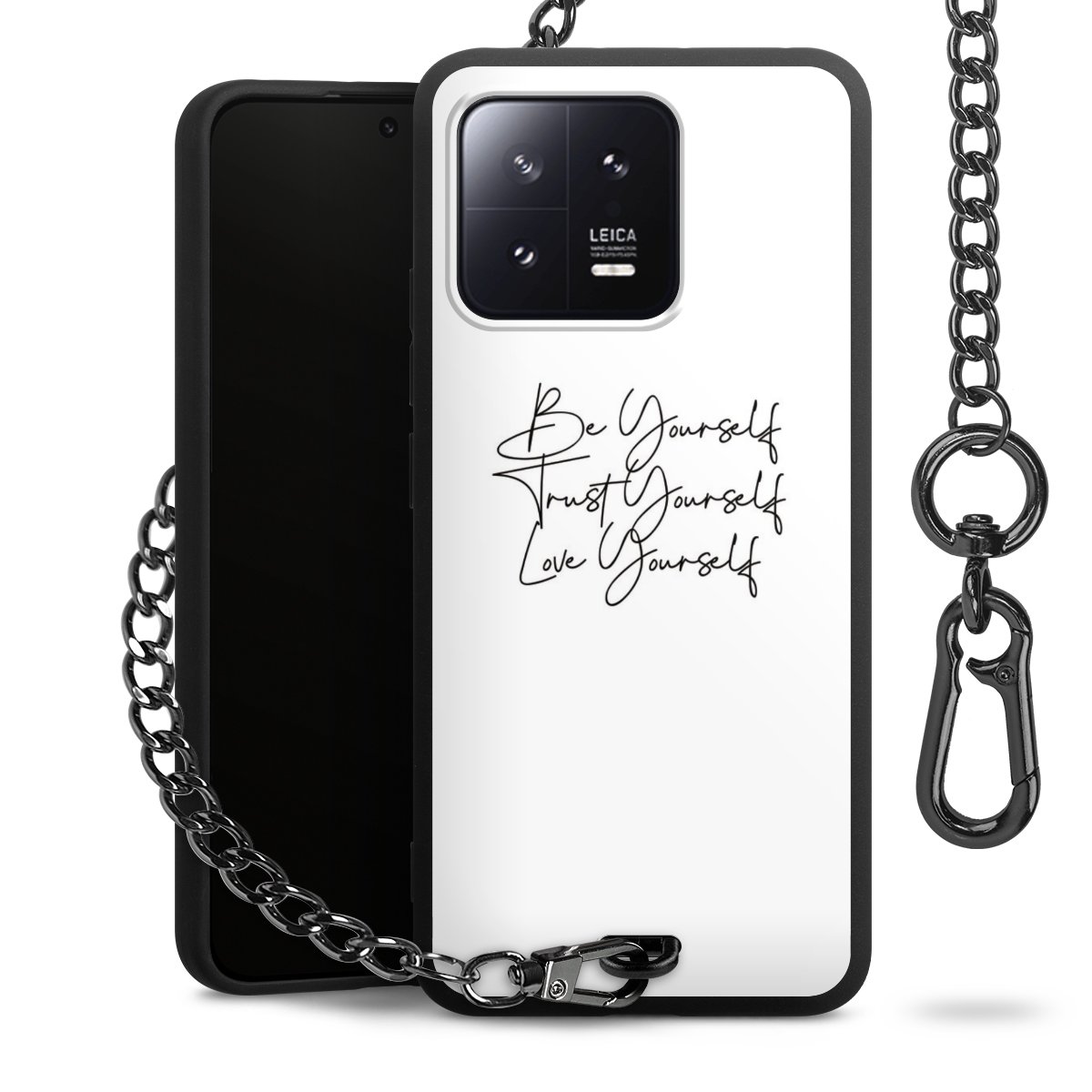 Die mattschwarze Silikon-Handyhülle besteht aus robustem TPU (thermoplastisches Polyurethan). Sie ist flexibel und schützt Dein Smartphone vor Stößen und Kratzern. Die Kette sowie der Karabinerhaken sind aus Metall in Gunmetal-Optik gefertigt. Für dieses Produkt kommen ausschließlich TÜV-geprüfte Materialien zum Einsatz.