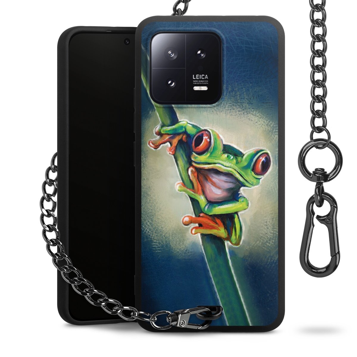Die Handyhülle verfügt über eine mittig am unteren Rand platzierte Öse, an der die Metallkette stabil befestigt ist. Bestelle die Hülle einfach für Dein Smartphone-Modell, dann passt sie wie angegossen und Du brauchst sie bloß einmal anzudrücken. Handy in die Tasche, Karabiner an den Hosenbund – schon kann die Party starten.