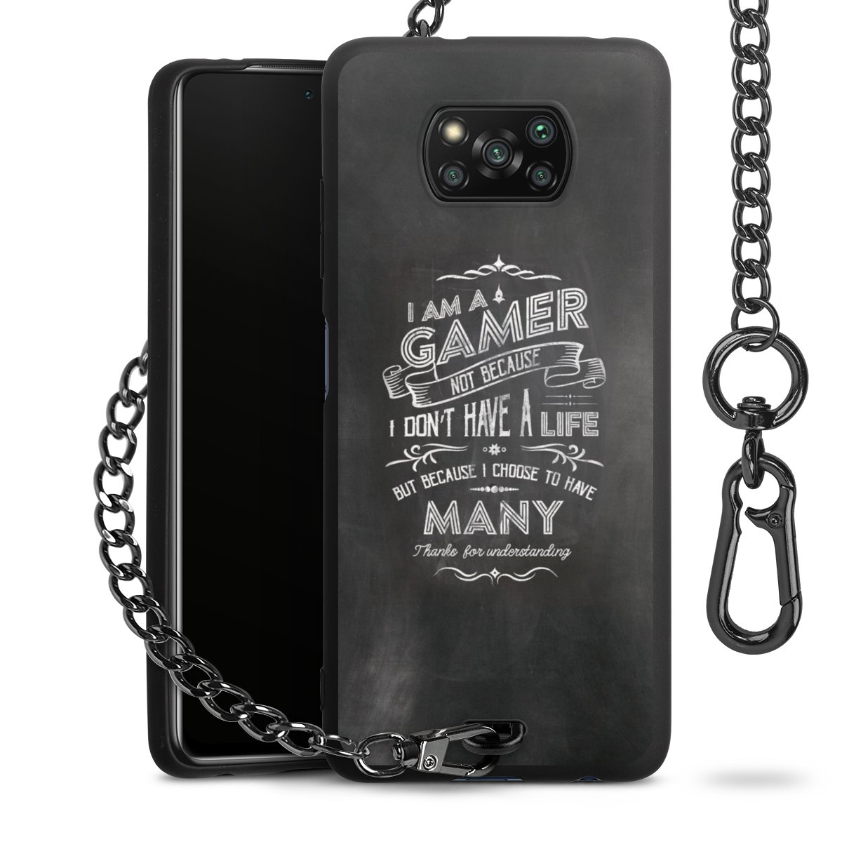 Die mattschwarze Silikon-Handyhülle besteht aus robustem TPU (thermoplastisches Polyurethan). Sie ist flexibel und schützt Dein Smartphone vor Stößen und Kratzern. Die Kette sowie der Karabinerhaken sind aus Metall in Gunmetal-Optik gefertigt. Für dieses Produkt kommen ausschließlich TÜV-geprüfte Materialien zum Einsatz.