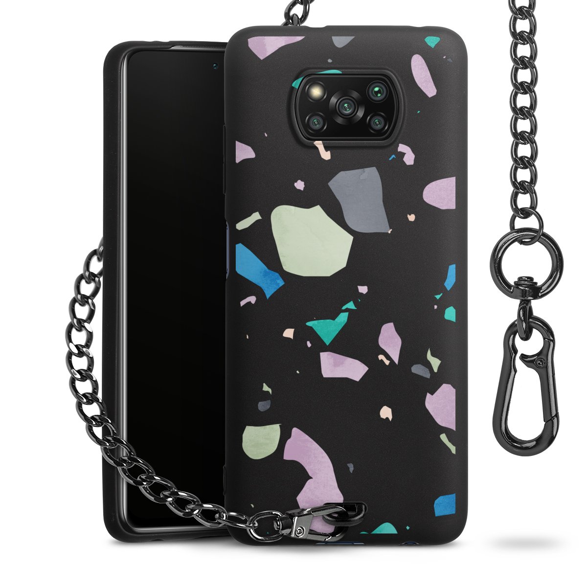 Die mattschwarze Silikon-Handyhülle besteht aus robustem TPU (thermoplastisches Polyurethan). Sie ist flexibel und schützt Dein Smartphone vor Stößen und Kratzern. Die Kette sowie der Karabinerhaken sind aus Metall in Gunmetal-Optik gefertigt. Für dieses Produkt kommen ausschließlich TÜV-geprüfte Materialien zum Einsatz.