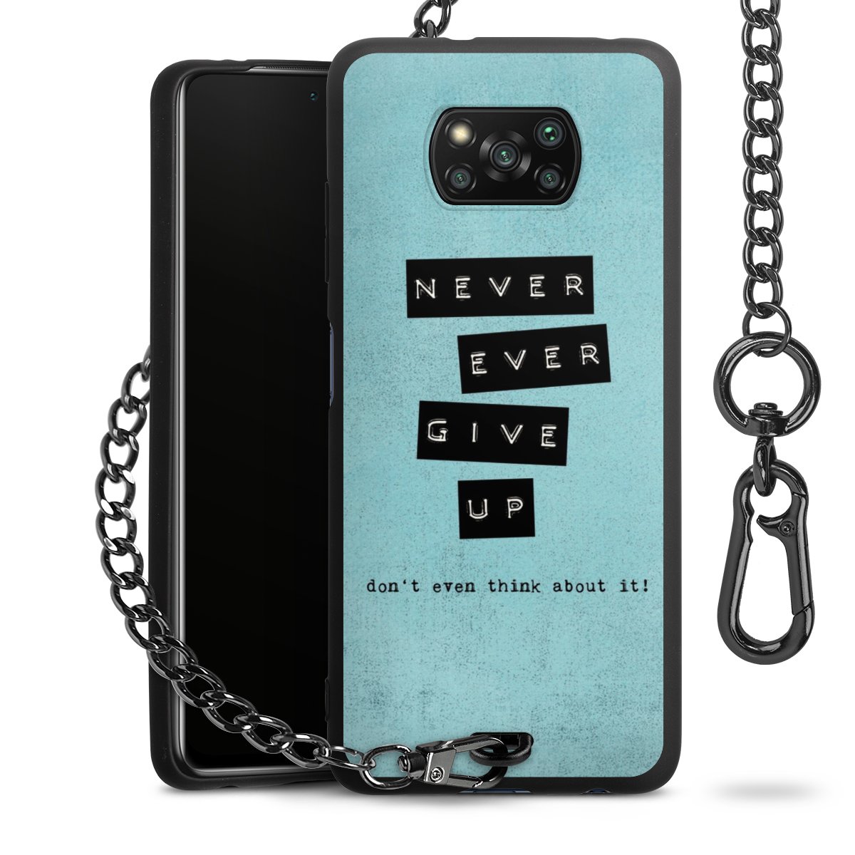 Die mattschwarze Silikon-Handyhülle besteht aus robustem TPU (thermoplastisches Polyurethan). Sie ist flexibel und schützt Dein Smartphone vor Stößen und Kratzern. Die Kette sowie der Karabinerhaken sind aus Metall in Gunmetal-Optik gefertigt. Für dieses Produkt kommen ausschließlich TÜV-geprüfte Materialien zum Einsatz.