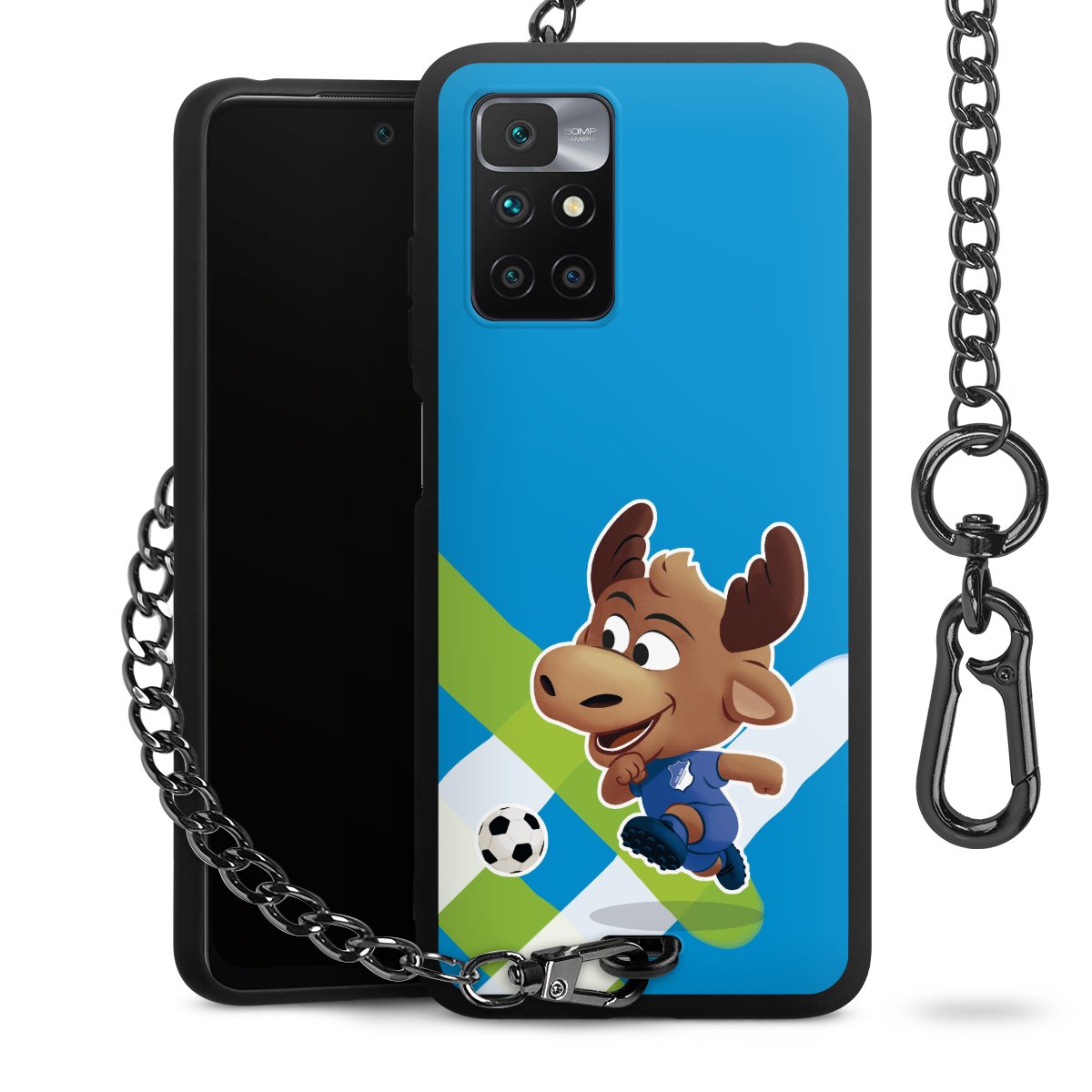 Die Handyhülle verfügt über eine mittig am unteren Rand platzierte Öse, an der die Metallkette stabil befestigt ist. Bestelle die Hülle einfach für Dein Smartphone-Modell, dann passt sie wie angegossen und Du brauchst sie bloß einmal anzudrücken. Handy in die Tasche, Karabiner an den Hosenbund – schon kann die Party starten.