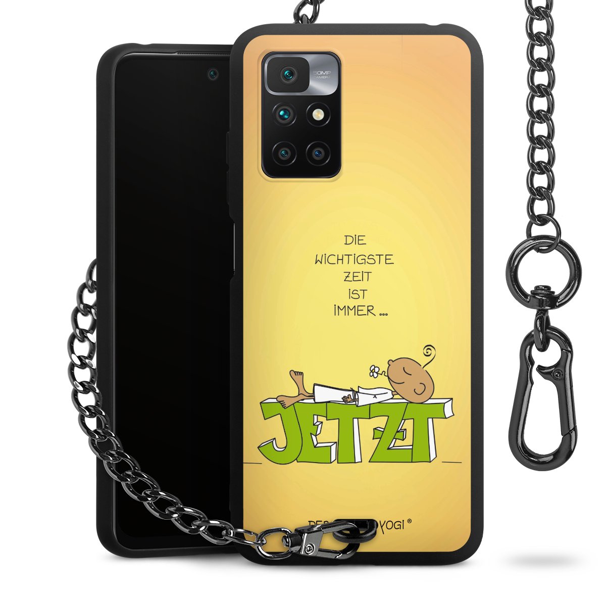 Die Handyhülle verfügt über eine mittig am unteren Rand platzierte Öse, an der die Metallkette stabil befestigt ist. Bestelle die Hülle einfach für Dein Smartphone-Modell, dann passt sie wie angegossen und Du brauchst sie bloß einmal anzudrücken. Handy in die Tasche, Karabiner an den Hosenbund – schon kann die Party starten.