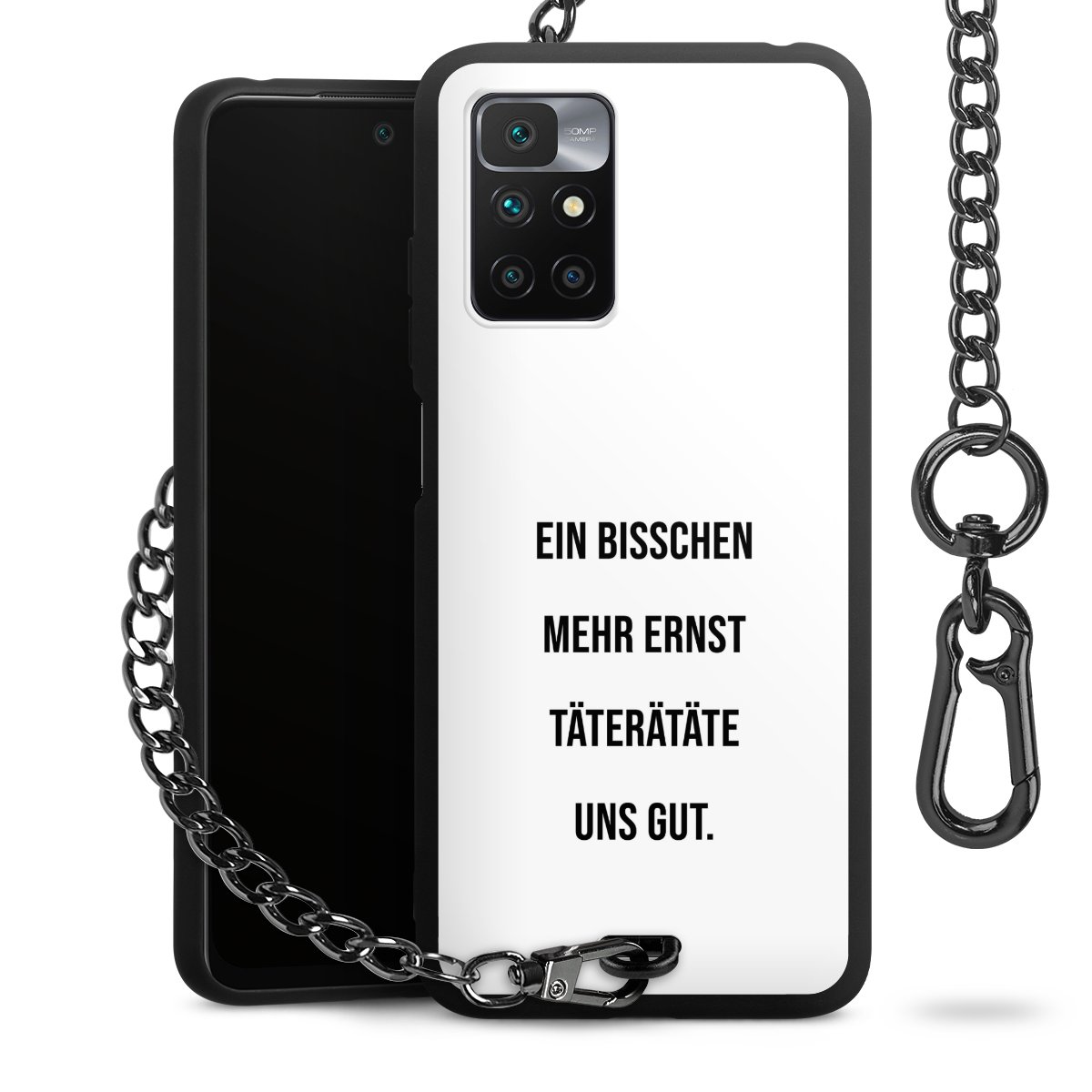 Die mattschwarze Silikon-Handyhülle besteht aus robustem TPU (thermoplastisches Polyurethan). Sie ist flexibel und schützt Dein Smartphone vor Stößen und Kratzern. Die Kette sowie der Karabinerhaken sind aus Metall in Gunmetal-Optik gefertigt. Für dieses Produkt kommen ausschließlich TÜV-geprüfte Materialien zum Einsatz.