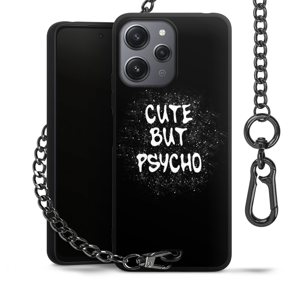 Die mattschwarze Silikon-Handyhülle besteht aus robustem TPU (thermoplastisches Polyurethan). Sie ist flexibel und schützt Dein Smartphone vor Stößen und Kratzern. Die Kette sowie der Karabinerhaken sind aus Metall in Gunmetal-Optik gefertigt. Für dieses Produkt kommen ausschließlich TÜV-geprüfte Materialien zum Einsatz.