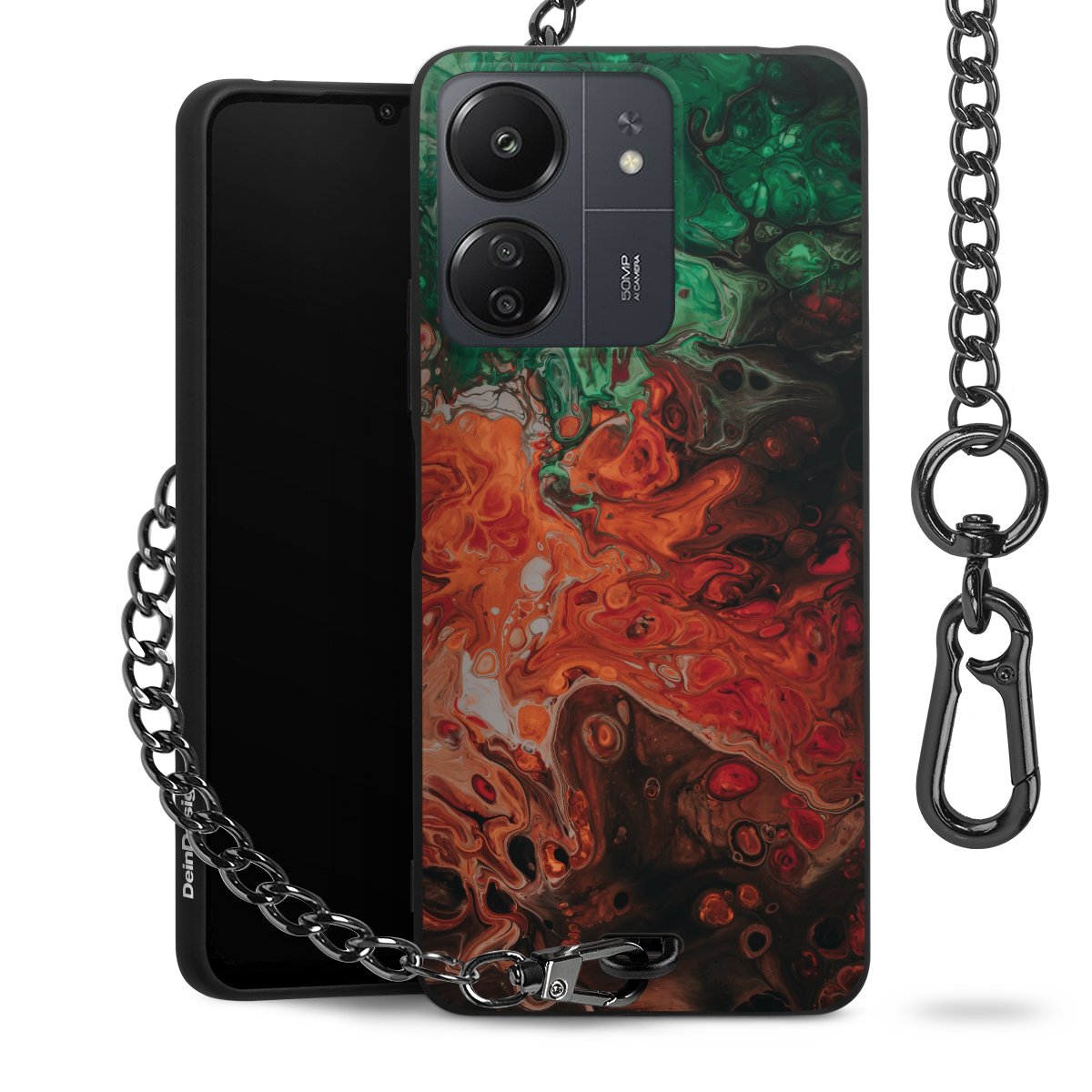 Die mattschwarze Silikon-Handyhülle besteht aus robustem TPU (thermoplastisches Polyurethan). Sie ist flexibel und schützt Dein Smartphone vor Stößen und Kratzern. Die Kette sowie der Karabinerhaken sind aus Metall in Gunmetal-Optik gefertigt. Für dieses Produkt kommen ausschließlich TÜV-geprüfte Materialien zum Einsatz.