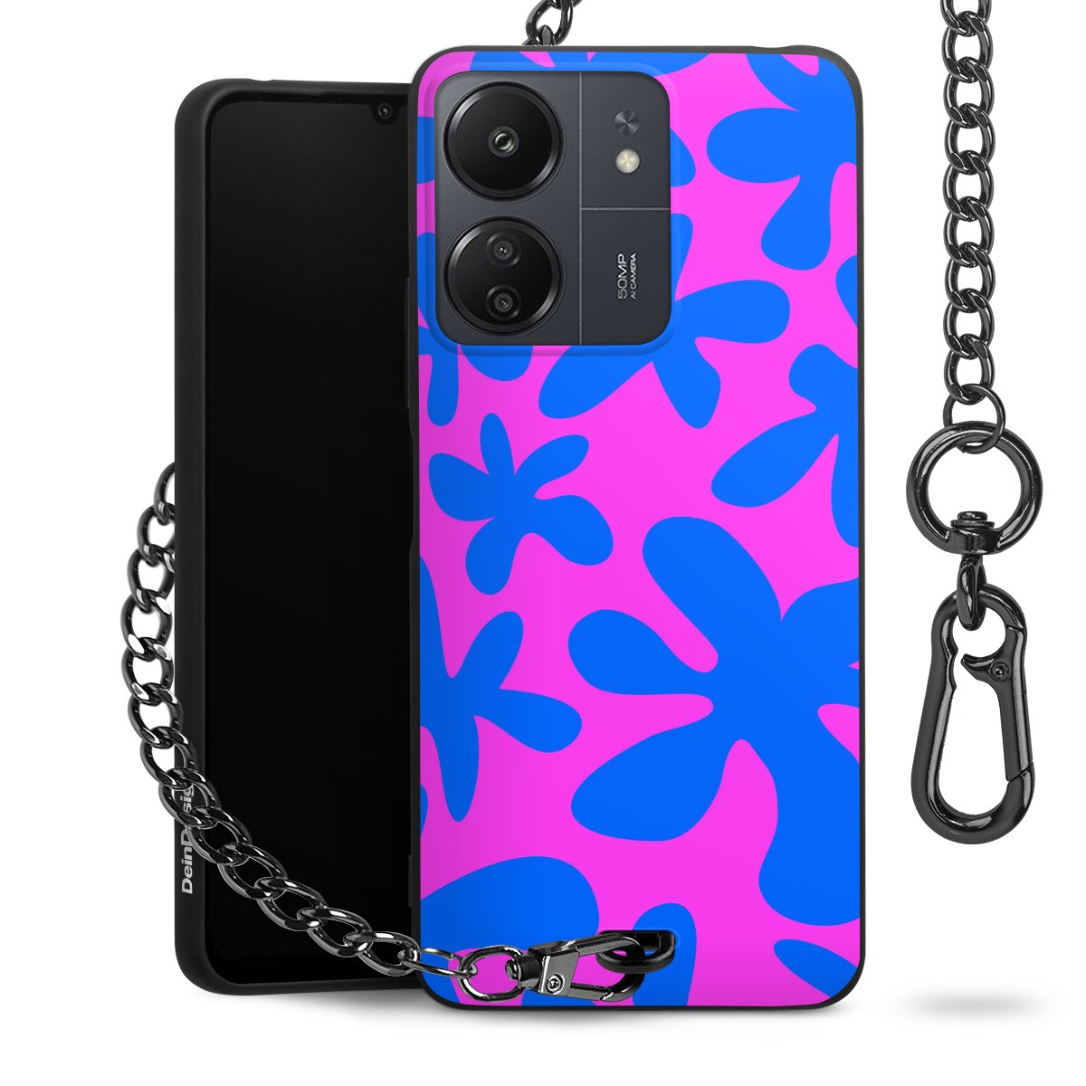 Die Handyhülle verfügt über eine mittig am unteren Rand platzierte Öse, an der die Metallkette stabil befestigt ist. Bestelle die Hülle einfach für Dein Smartphone-Modell, dann passt sie wie angegossen und Du brauchst sie bloß einmal anzudrücken. Handy in die Tasche, Karabiner an den Hosenbund – schon kann die Party starten.