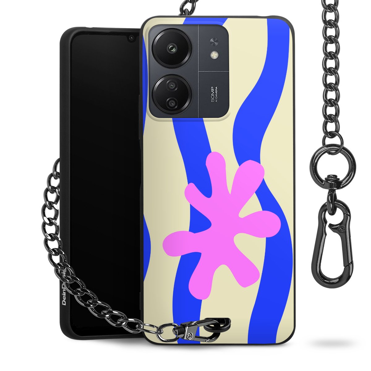Die Handyhülle verfügt über eine mittig am unteren Rand platzierte Öse, an der die Metallkette stabil befestigt ist. Bestelle die Hülle einfach für Dein Smartphone-Modell, dann passt sie wie angegossen und Du brauchst sie bloß einmal anzudrücken. Handy in die Tasche, Karabiner an den Hosenbund – schon kann die Party starten.
